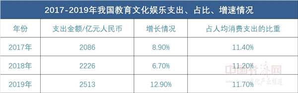 据国家统计局2019年统计数据★✿★✿,我国人均教育文化娱乐消费支出增速为12.9%★✿★✿,与人均医疗保健消费支出增速持平★✿★✿,高于其他消费支出增速★✿★✿。纵观历年文娱消费支出占比情况★✿★✿,在整个居民人均消费支出中★✿★✿,文娱消费支出所占的比重并不是很高★✿★✿,仍有较大增长空间★✿★✿。